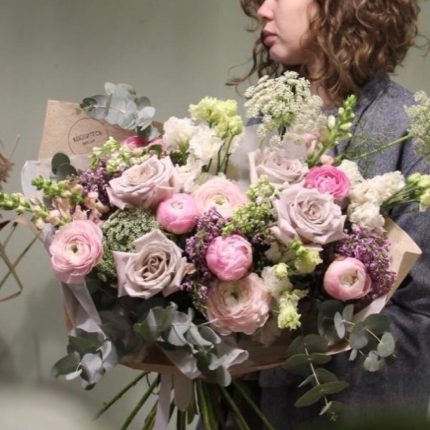 Цветы в коробке с гортензией,пион розами,матиолой,альстромерией,эустомой,колосьями пшеницы и эвкалиптом