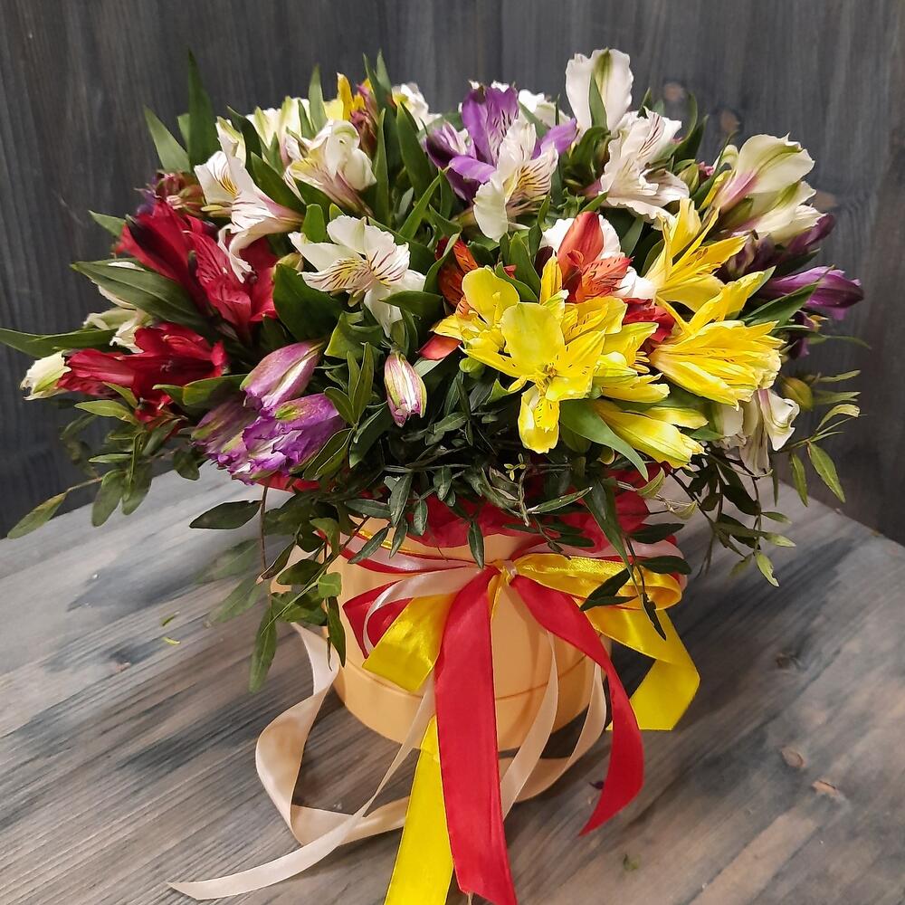 Лента атласная – 3 шт.Коробка шляпная – 1 шт.Фисташка – 3 шт.Оазис флористический – 1 шт.альстромерия микс – 25 шт.