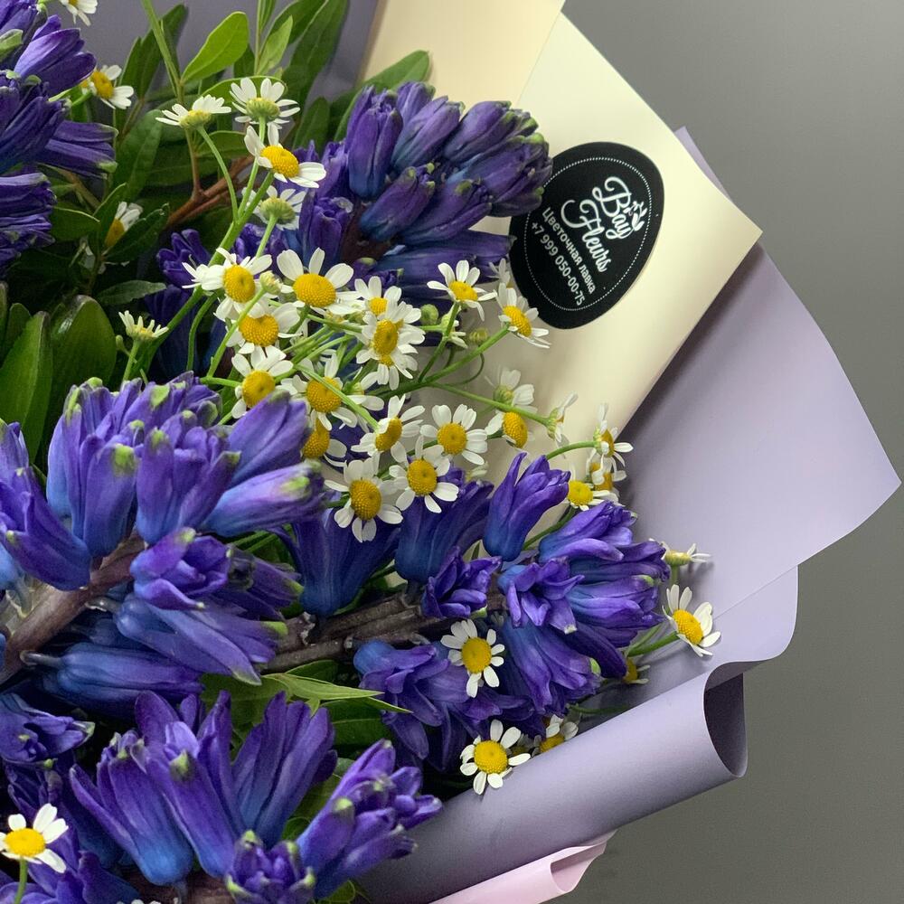 Гиацинт синий – 7 шт.Матрикария – 3 шт.Фисташка – 5 шт.Упаковка дизайнерская – 1 шт.Лента атласная – 2 шт.