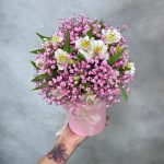 Альстромерия – 5 шт.Гипсофила розовая – 3 шт.Коробка d12 – 1 шт.Оазис – 1 шт.