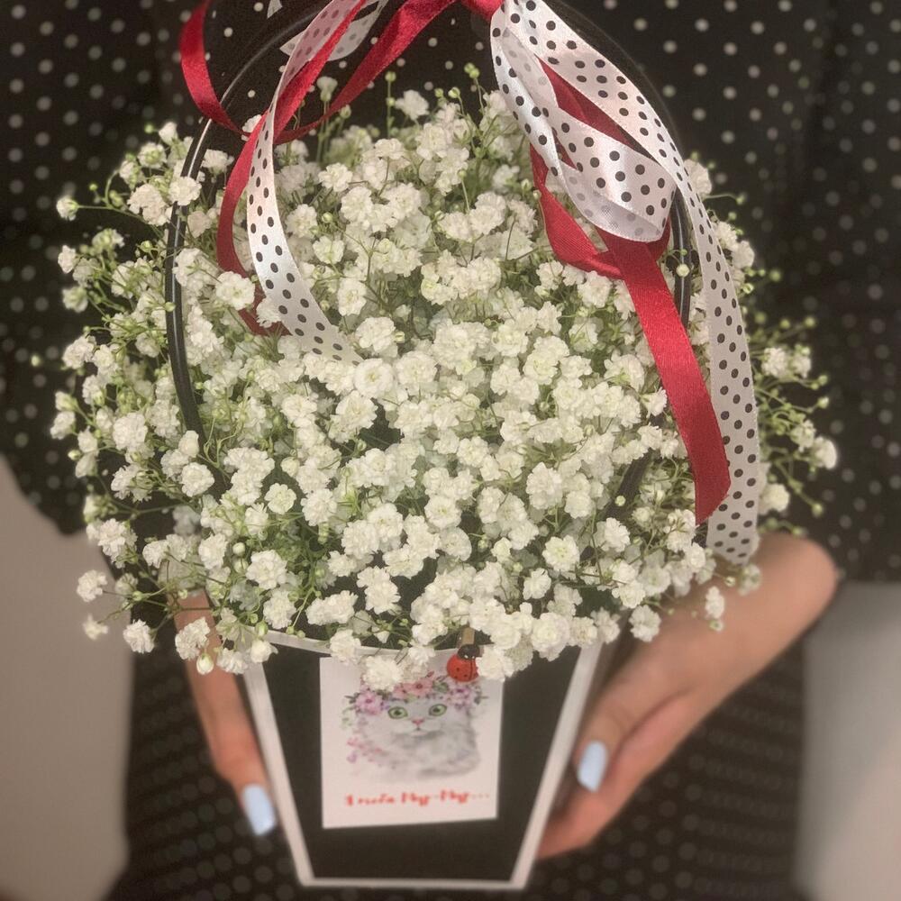 “Сиреневый туман” – композиция из гипсофилы в шляпной коробке