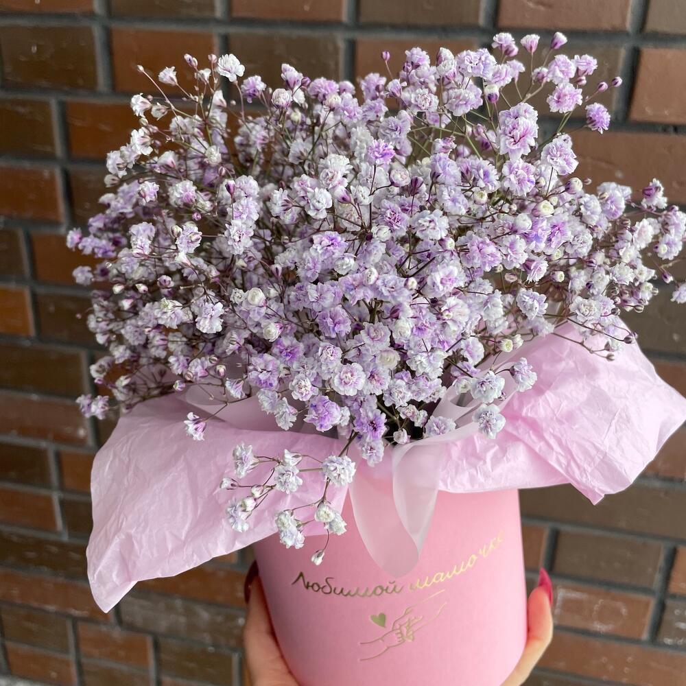 “Сиреневый туман” – композиция из гипсофилы в шляпной коробке
