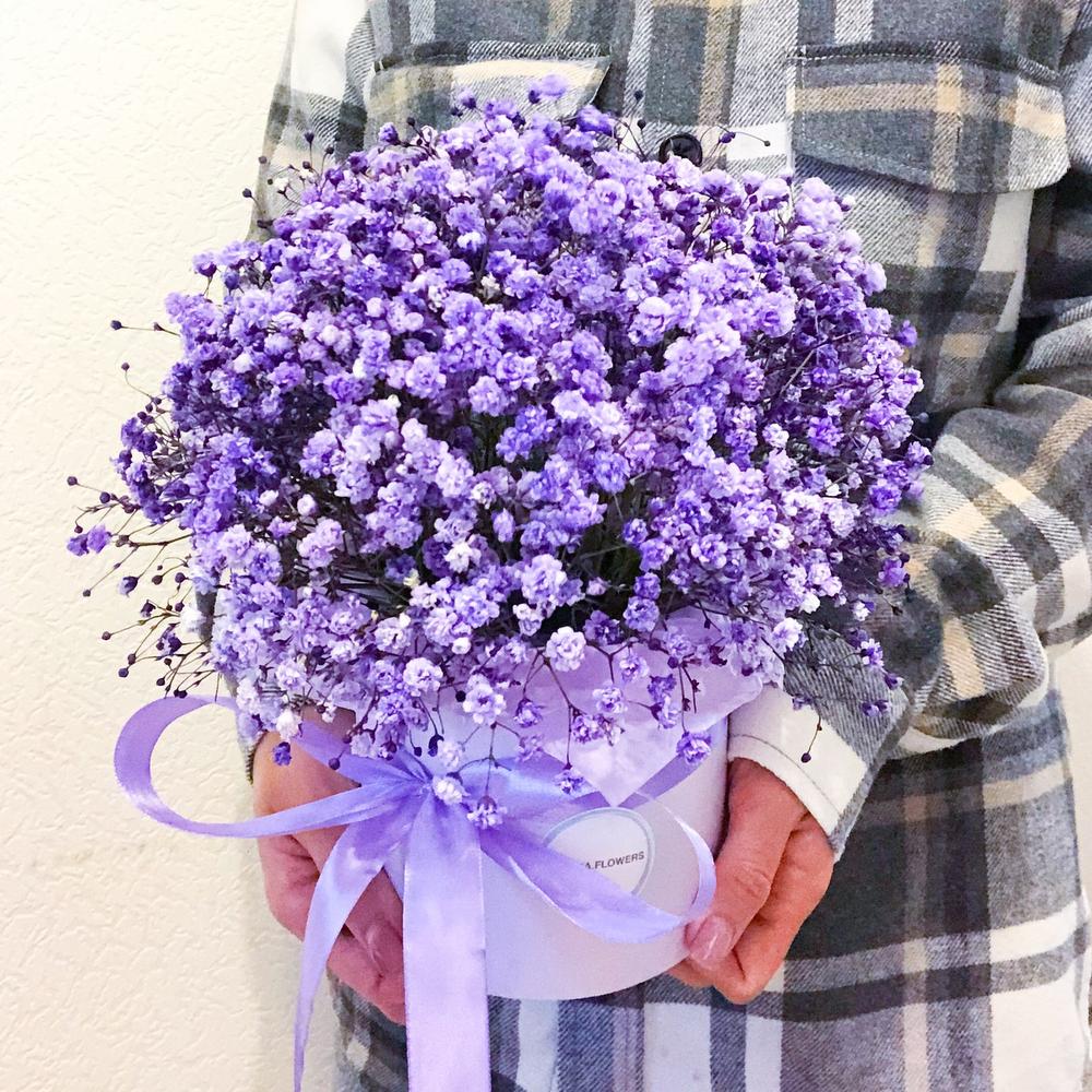 “Сиреневый туман” – композиция из гипсофилы в шляпной коробке