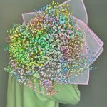 Лента атласная – 1 шт.Упаковка дизайнерская – 1 шт.гипсофила цветная – 11 шт.