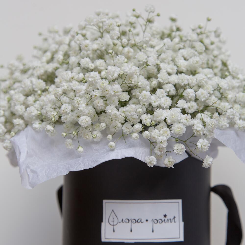 Композиция из белой гипсофилы в коробке