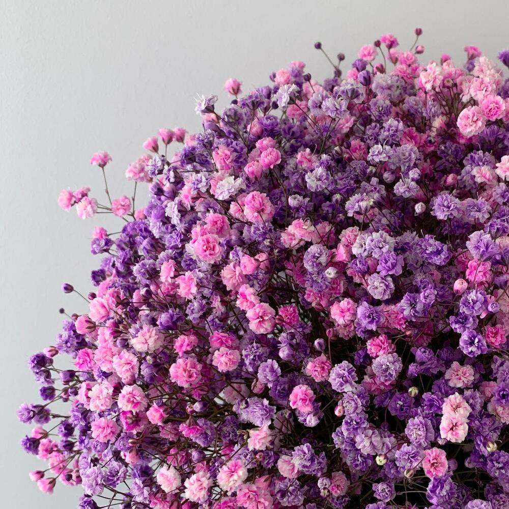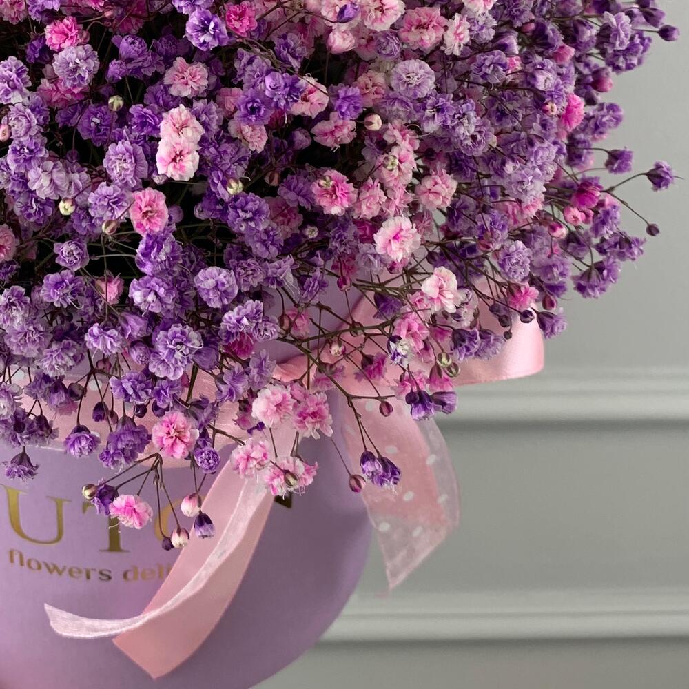“Сиреневый туман” – композиция из гипсофилы в шляпной коробке