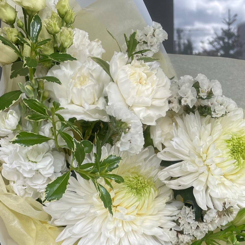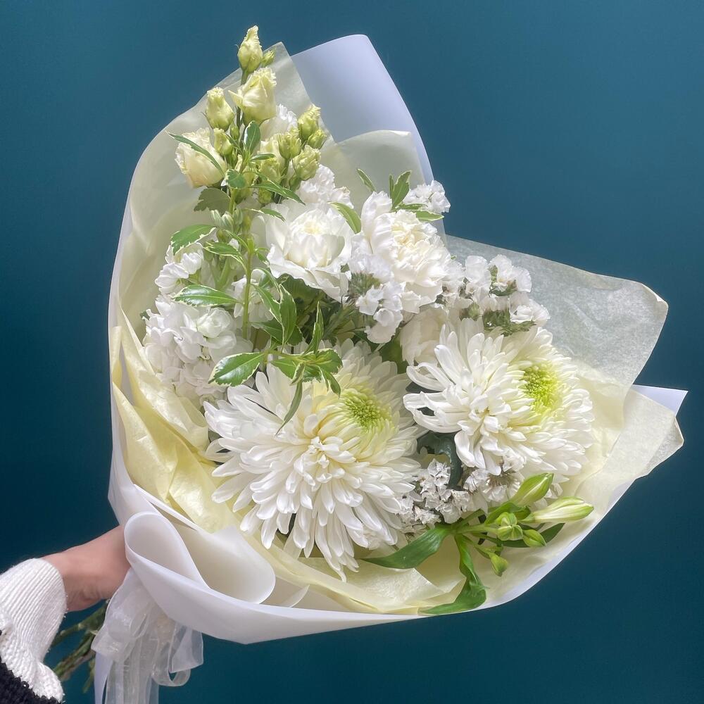 Хризантема – 2 шт.Статица – 1 шт.Альстромерия – 1 шт.Питтоспорум – 1 шт.Лизиантус – 1 шт.Диантус – 3 шт.Упаковка дизайнерская – 1 шт.