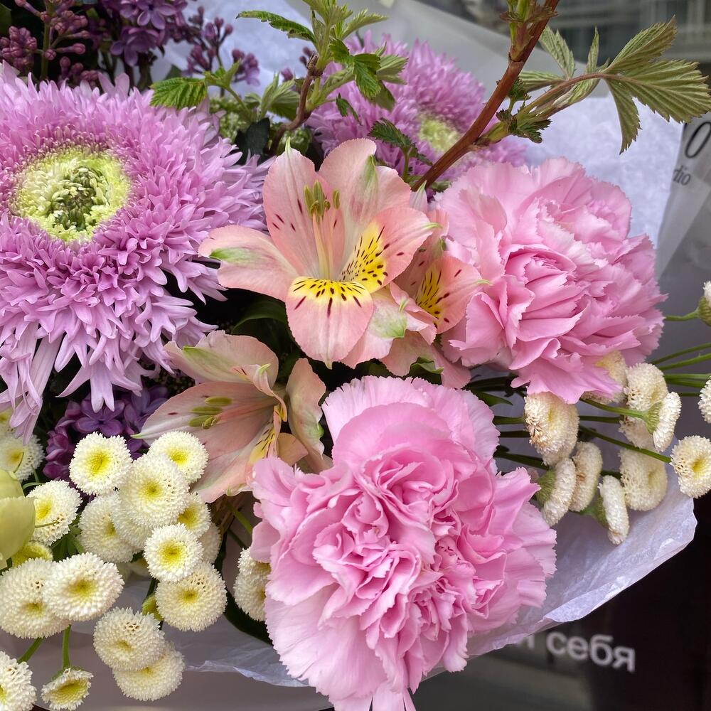 Хризантема одноголовая – 3 шт.Диантус сортовой – 3 шт.Альстромерия – 2 шт.матрикарья – 2 шт.антиринум белый – 2 шт.Сирень – 2 шт.эустома белая алиса – 2 шт.ветви малины – 3 шт.Упаковка дизайнерская – 4 шт.Лента атласная – 1 шт.
