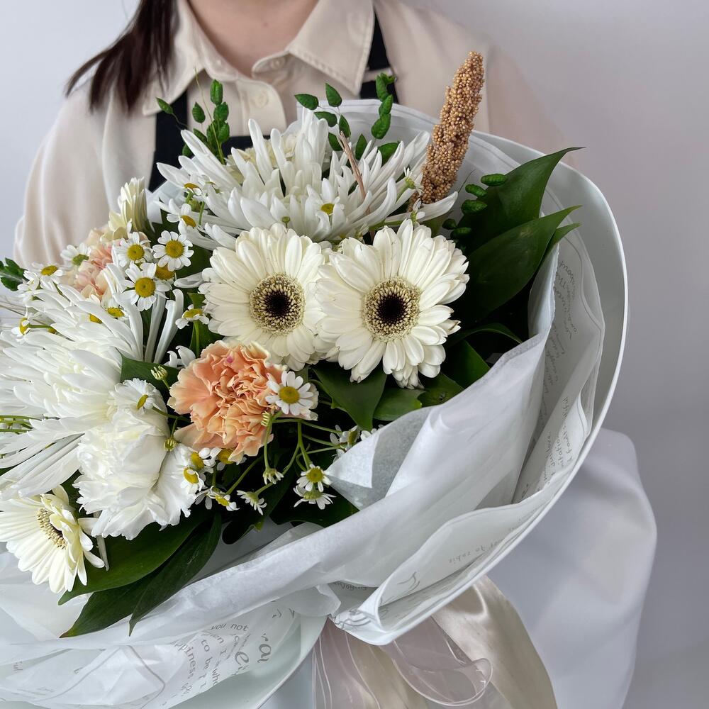 Матрикария – 5 шт.Диантус – 5 шт.Гербера – 5 шт.Хризантема – 3 шт.Салал пучок – 1 шт.фаомиран – 2 шт.Тишью – 6 шт.Лента атласная – 2 шт.бриза пучок – 1 шт.