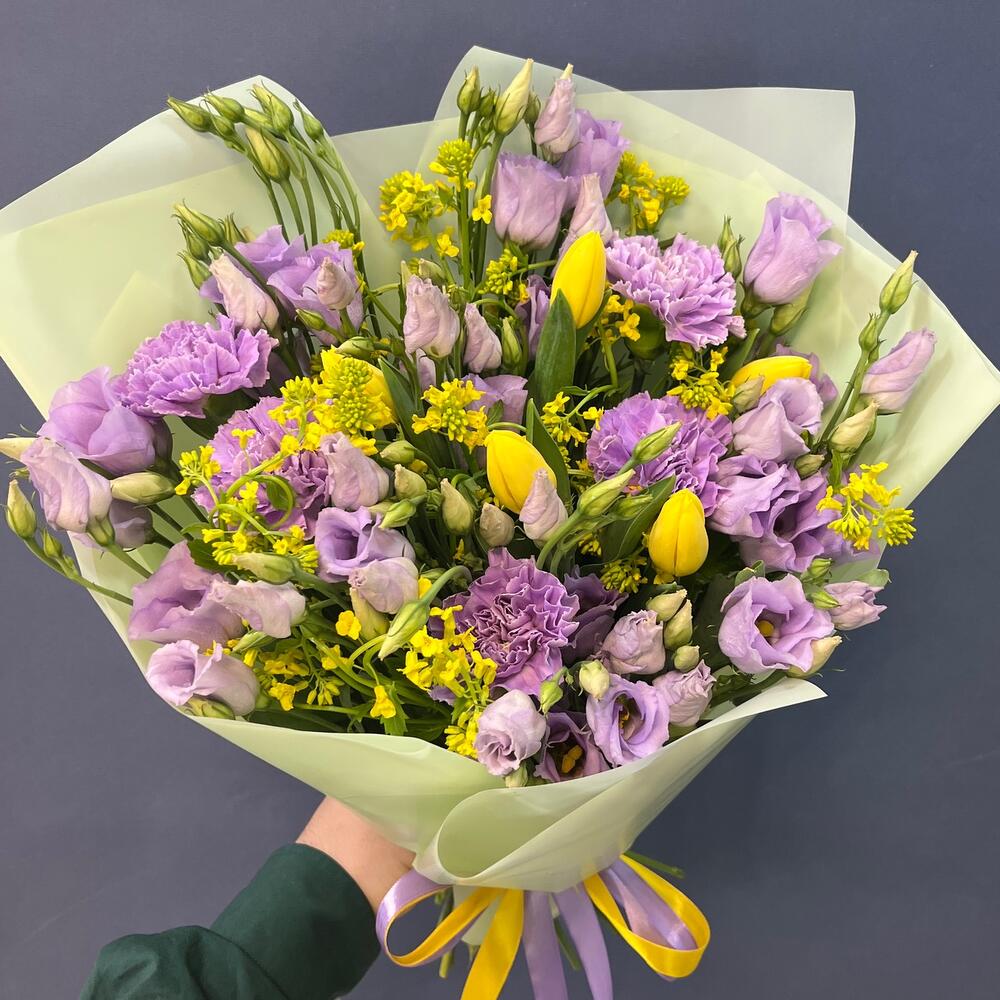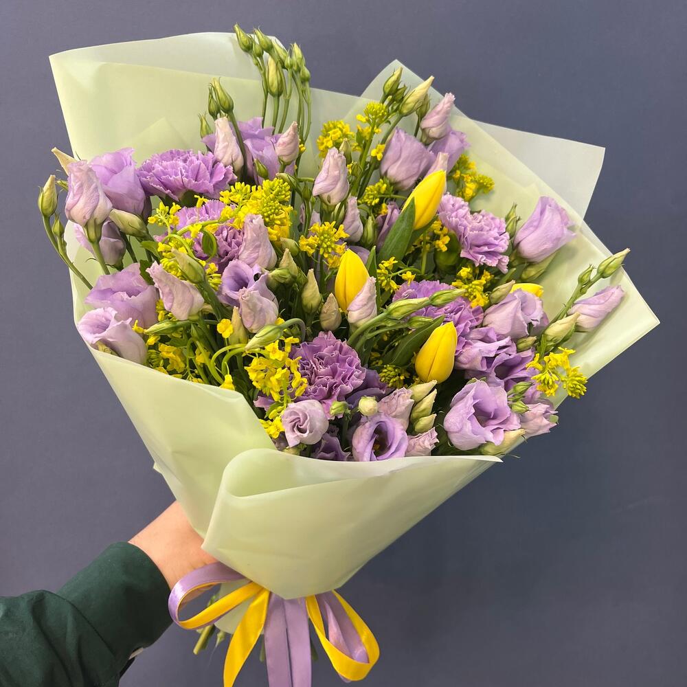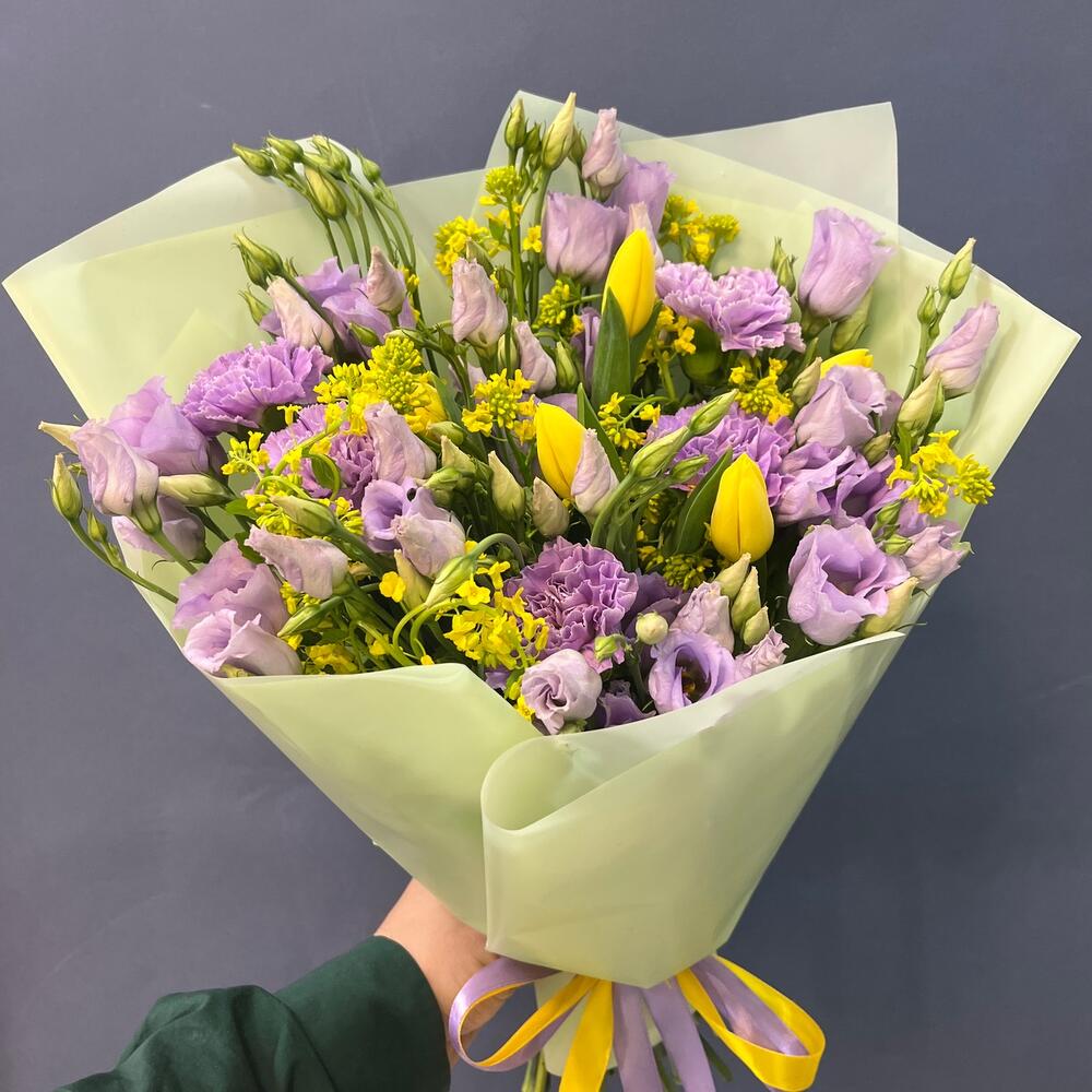 Тюльпан желтый – 5 шт.Лизиантус лавандовый – 5 шт.Диантус лунный – 5 шт.Лента атласная желтая – 1 шт.Лента атласная фиолетовая – 1 шт.упаковка корейская пленка мятная – 1 шт.экзотика зелень желтая – 10 шт.