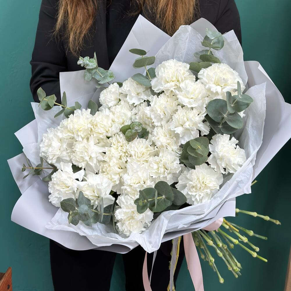 Эвкалипт – 1 шт.Лента атласная – 2 шт.современная упаковка с тишью – 2 шт.диантус сортовой (гвоздика) – 25 шт.