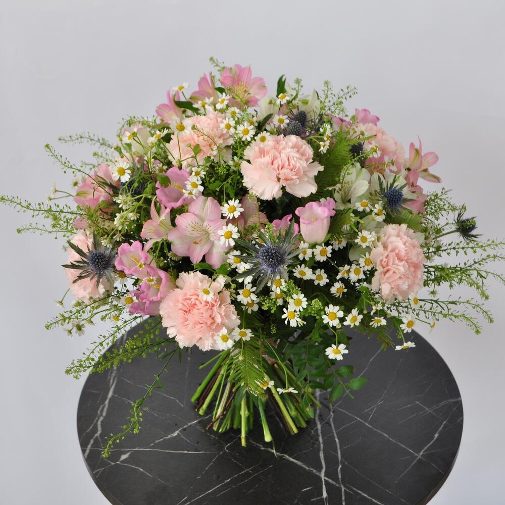 Альстромерия – 6 шт.Кампанула – 10 шт.Тласпи – 1 шт.Эрингиум – 4 шт.Гвоздика розовая – 9 шт.Ромашка кустовая – 15 шт.Фисташка – 8 шт.амбрелла – 3 шт.