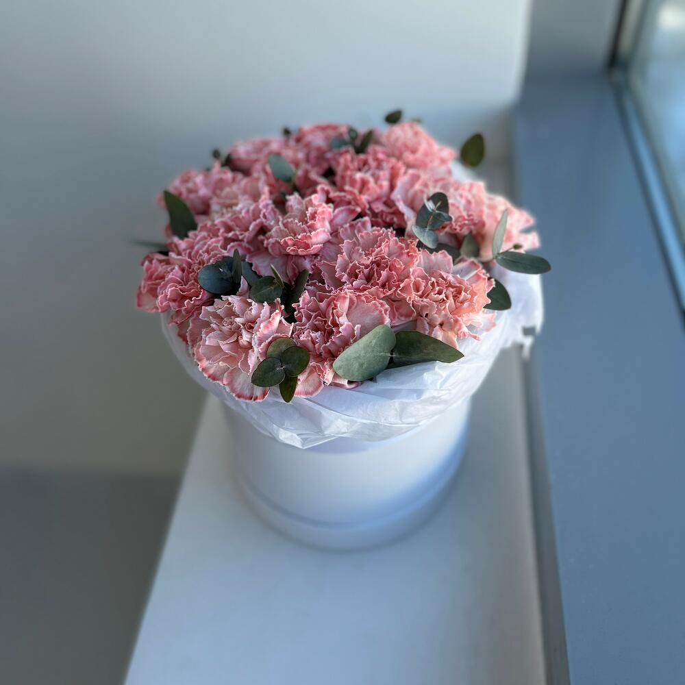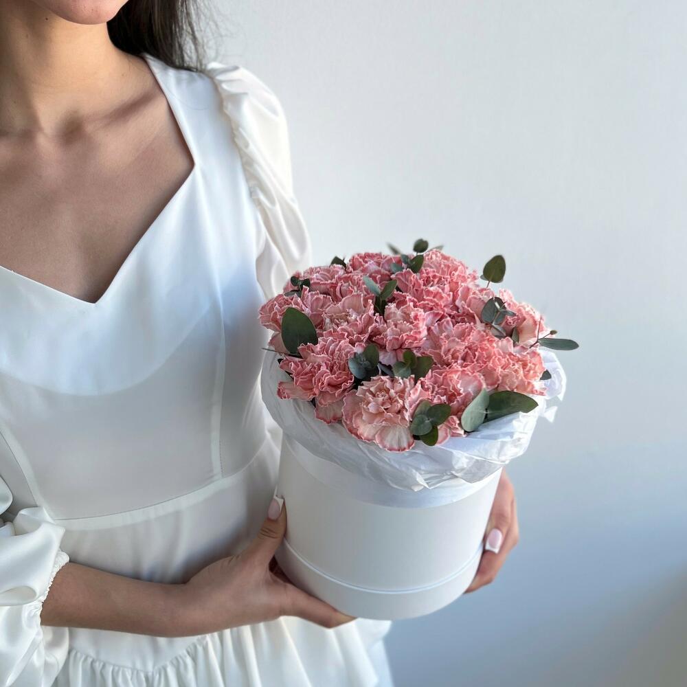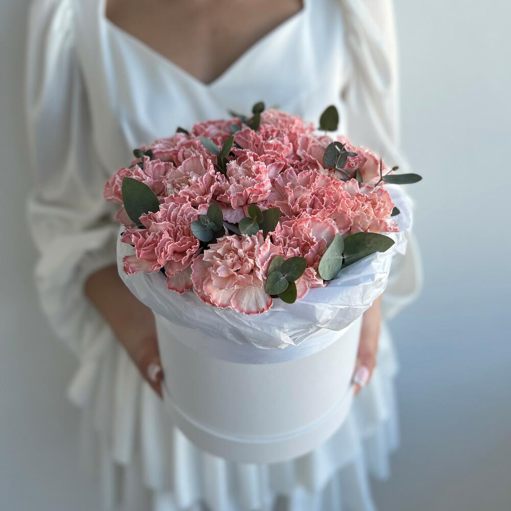 Шляпная коробка с розовой гвоздикой и эвкалиптом, небольшого размера, 20 см в диаметре и 25 см высотой