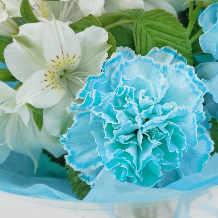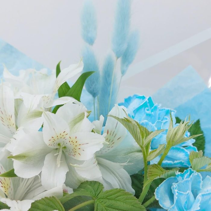 Упаковка дизайнерская – 1 шт.Лагурус – 5 шт.Средство для продления жизни цветов – 1 шт.рускус зелень ветка – 2 шт.альстромерия премиум – 2 шт.гвоздика молли голубая – 3 шт.