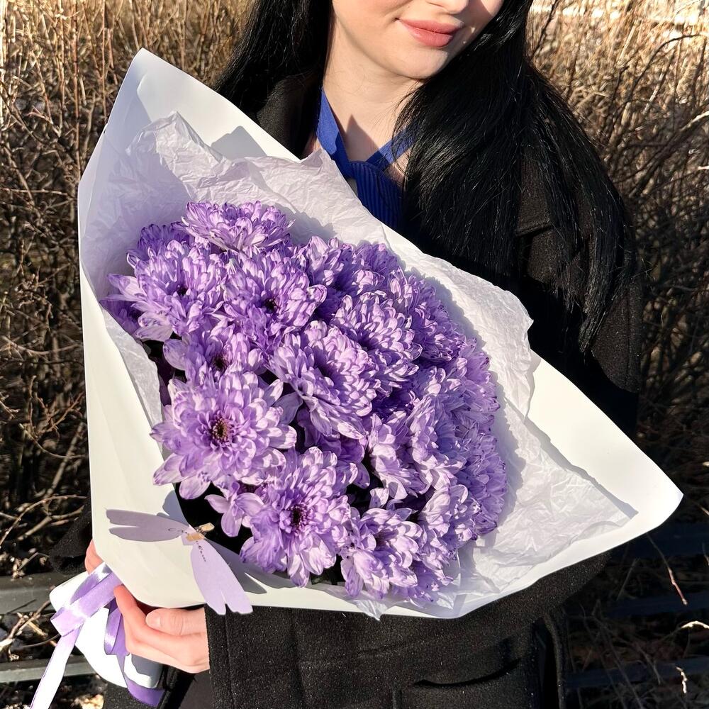 Лента атласная – 1 шт.Открыточка с вашими пожеланиями – 1 шт.Тишью белое – 2 шт.пленка матовая белая – 2 шт.хризантема кустовая крашенная фиолетовая – 5 шт.