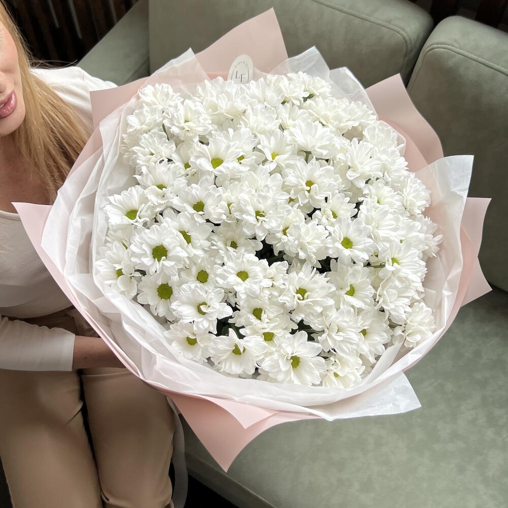Пленка матовая – 1 шт.Хризантема Кустовая Бакарди белая – 15 шт.тишью хрустящая – 1 шт.открытка брендированная в подарок – 1 шт.