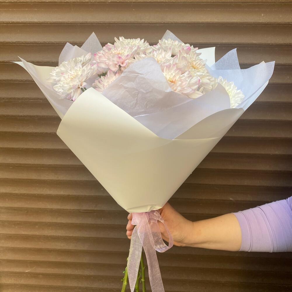 Хризантема кустовая – 5 шт.Лента атласная – 1 шт.Тишью белое – 1 шт.Пленка дизайнерская – 2 шт.