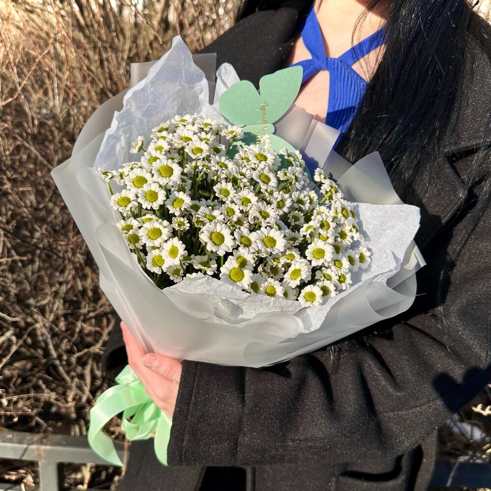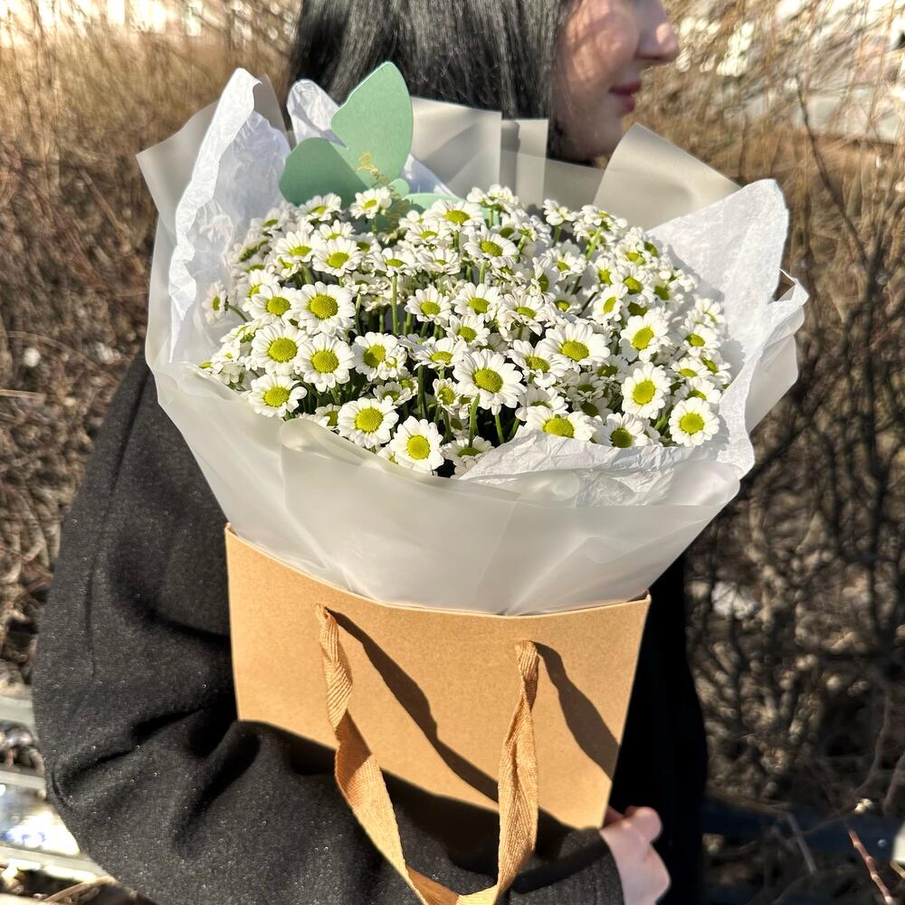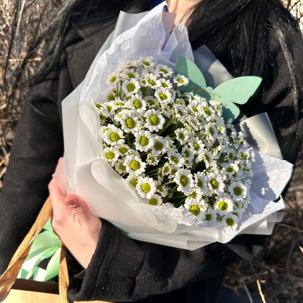 Нежный букет из 7 веточек белоснежных сантиний. Стильная упаковка из мятого тишью и полупрозрачной пленки придает цветам еще больше нежности и воздушности. Крафтовый пакет очень удобен при транспортировке букета.В подарок к заказу прилагается: Открытка бабочка – передаст … Показать ещёваши послания(поздравления) получателю и подарит еще больше летнего настроения