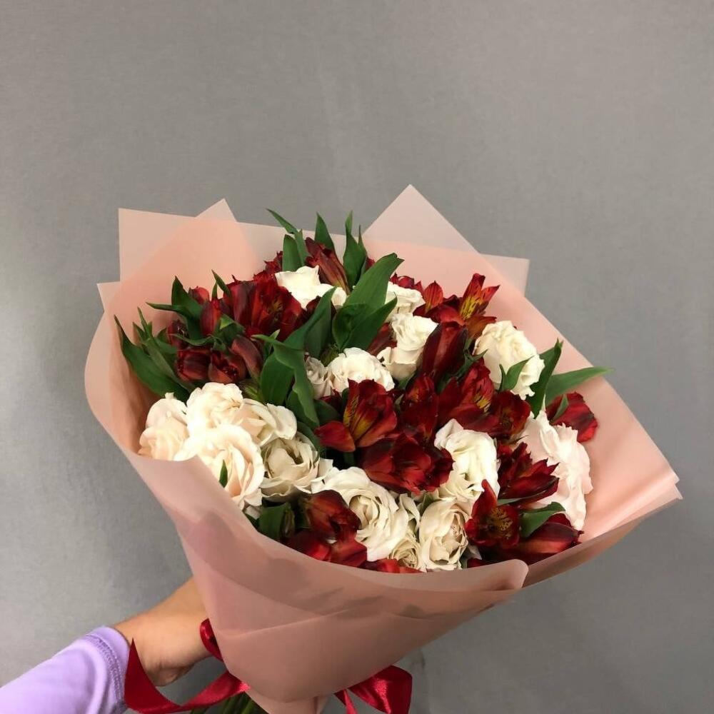 Альстромерия – 10 шт.Кустовая роза – 5 шт.Лента атласная – 1 шт.Пленка матовая – 1 шт.