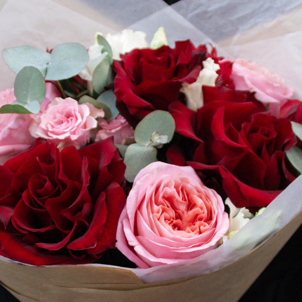 Французская роза – 3 шт.Пионовидная роза – 3 шт.Кустовая роза – 1 шт.Эустома – 1 шт.Альстромерия – 2 шт.Эвкалипт – 2 шт.Тишью – 2 шт.Крафт – 2 шт.Атласная лента – 2 шт.