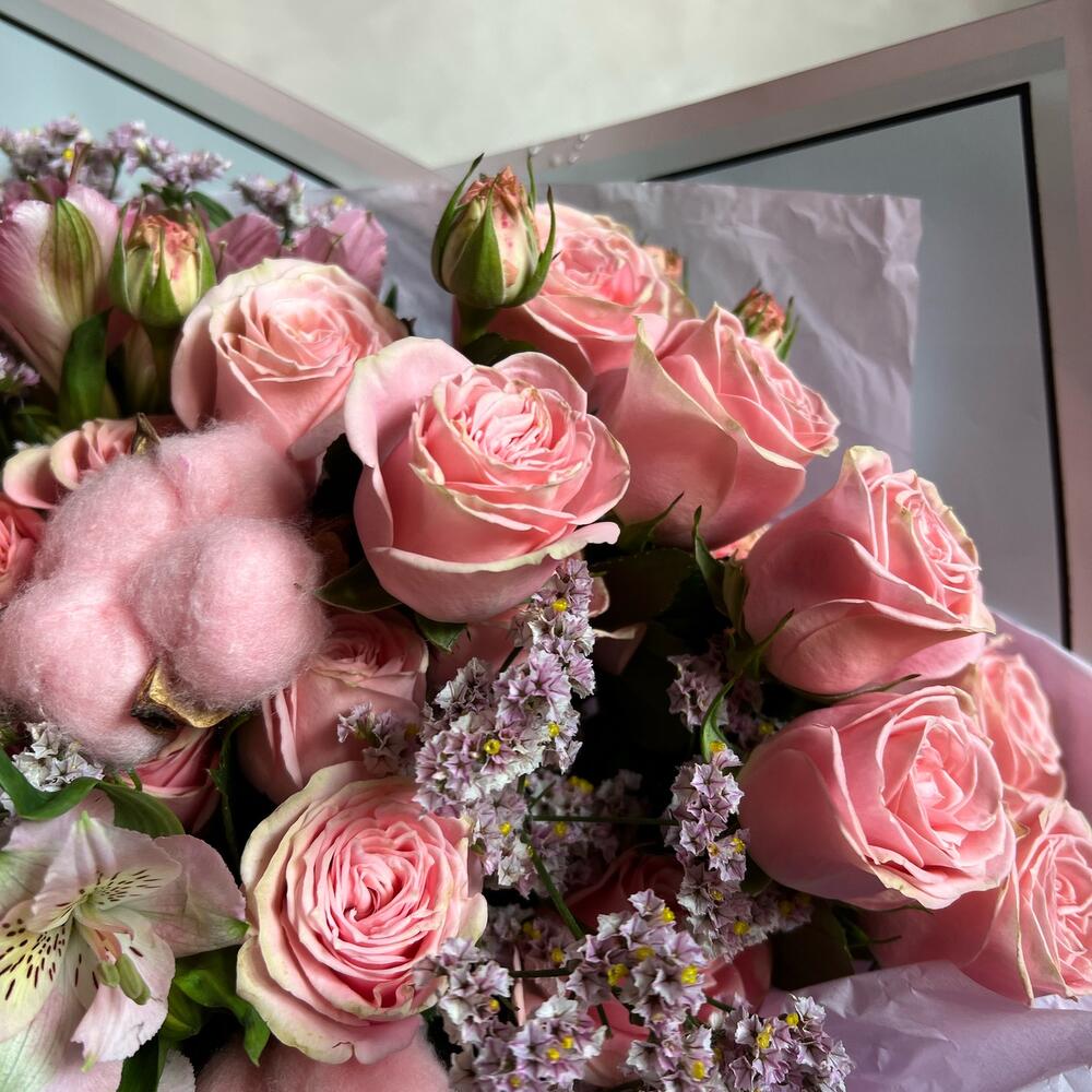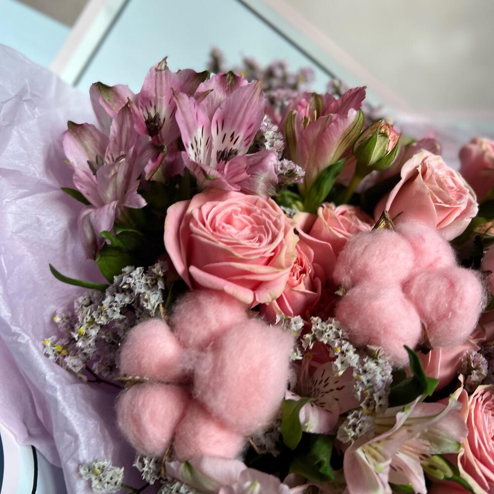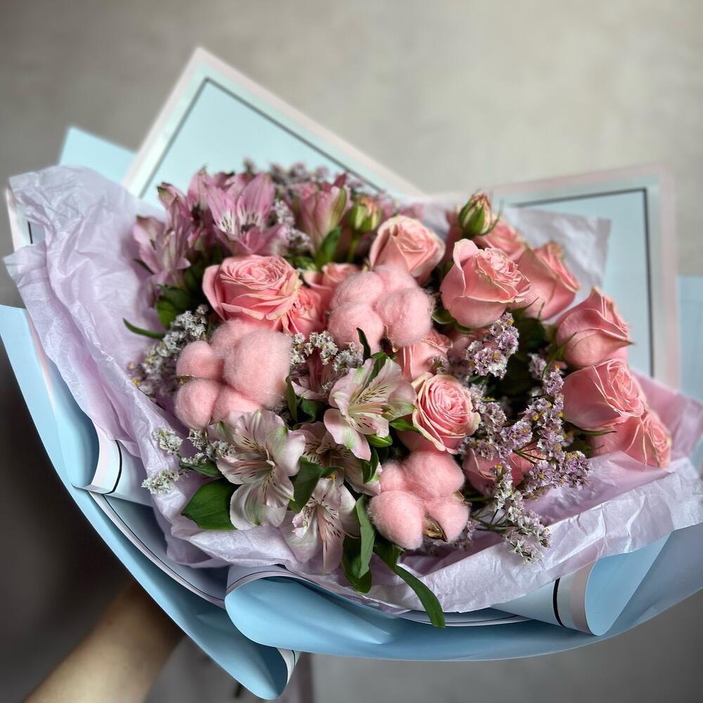 Кустовая роза – 3 шт.Альстромерия – 3 шт.Лимониум – 2 шт.Хлопок (сухоцвет) – 3 шт.декоративная упаковка – 1 шт.Атласная лента – 1 шт.