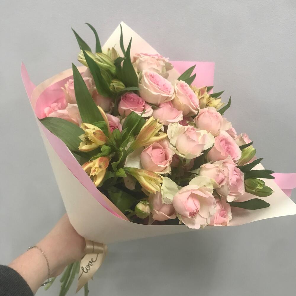 Роза кустовая розовая – 5 шт.Альстромерия желтая – 4 шт.Упаковка дизайнерская – 1 шт.Лента атласная – 1 шт.