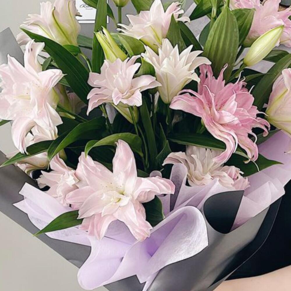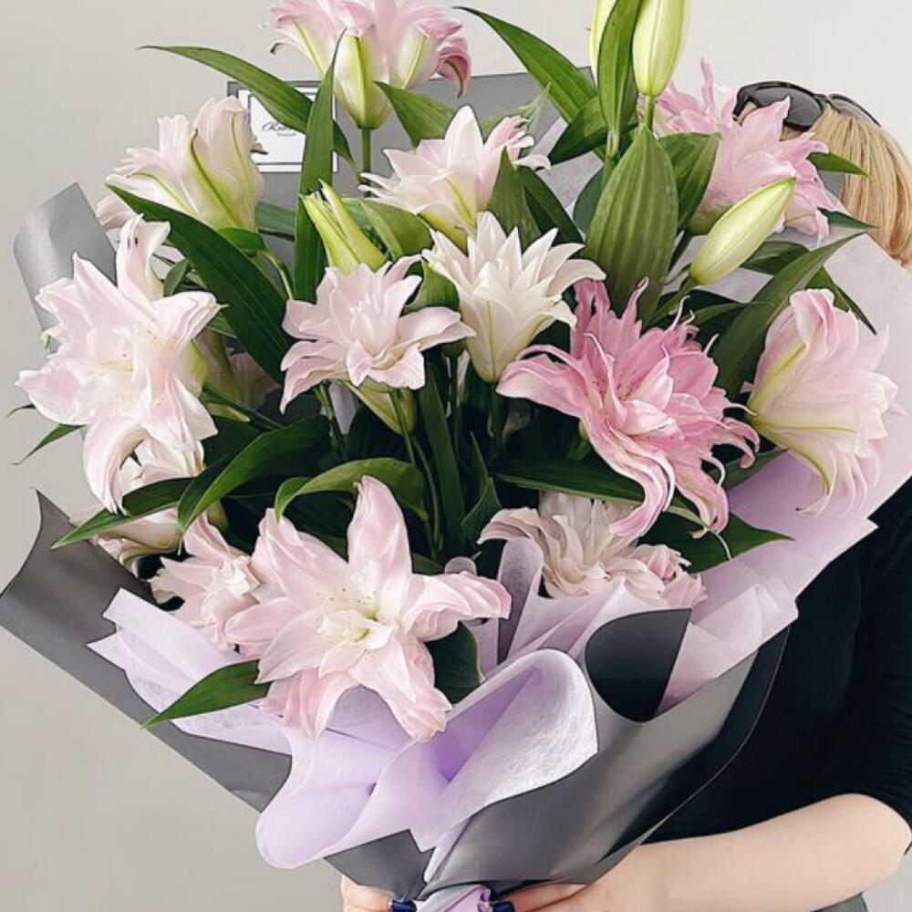 Лента атласная – 2 шт.Упаковка дизайнерская – 3 шт.лилия махровая премиум – 7 шт.
