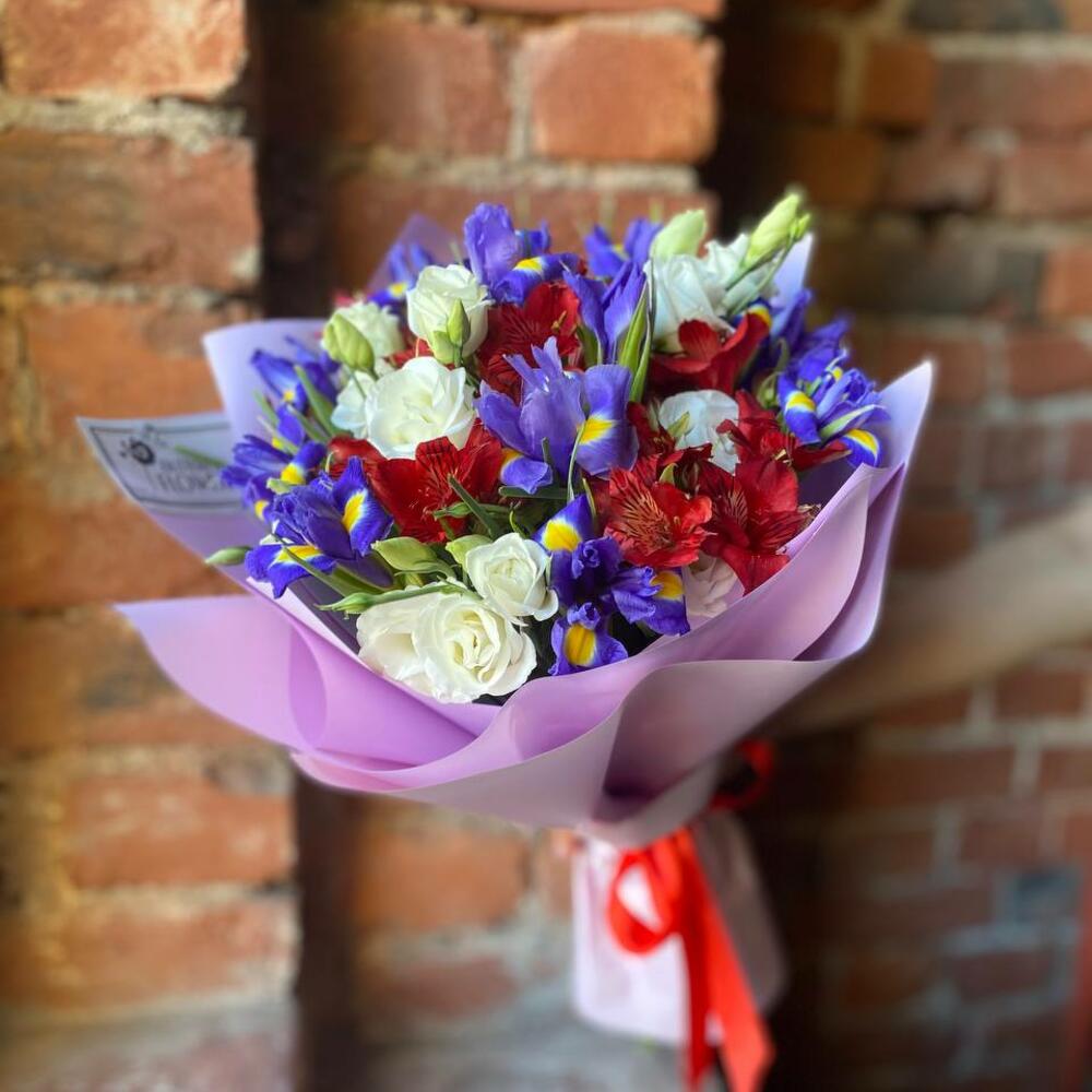 Букет из альстромерии, эустомы и ирисов в стильной упаковке “Ситцевый платочек”