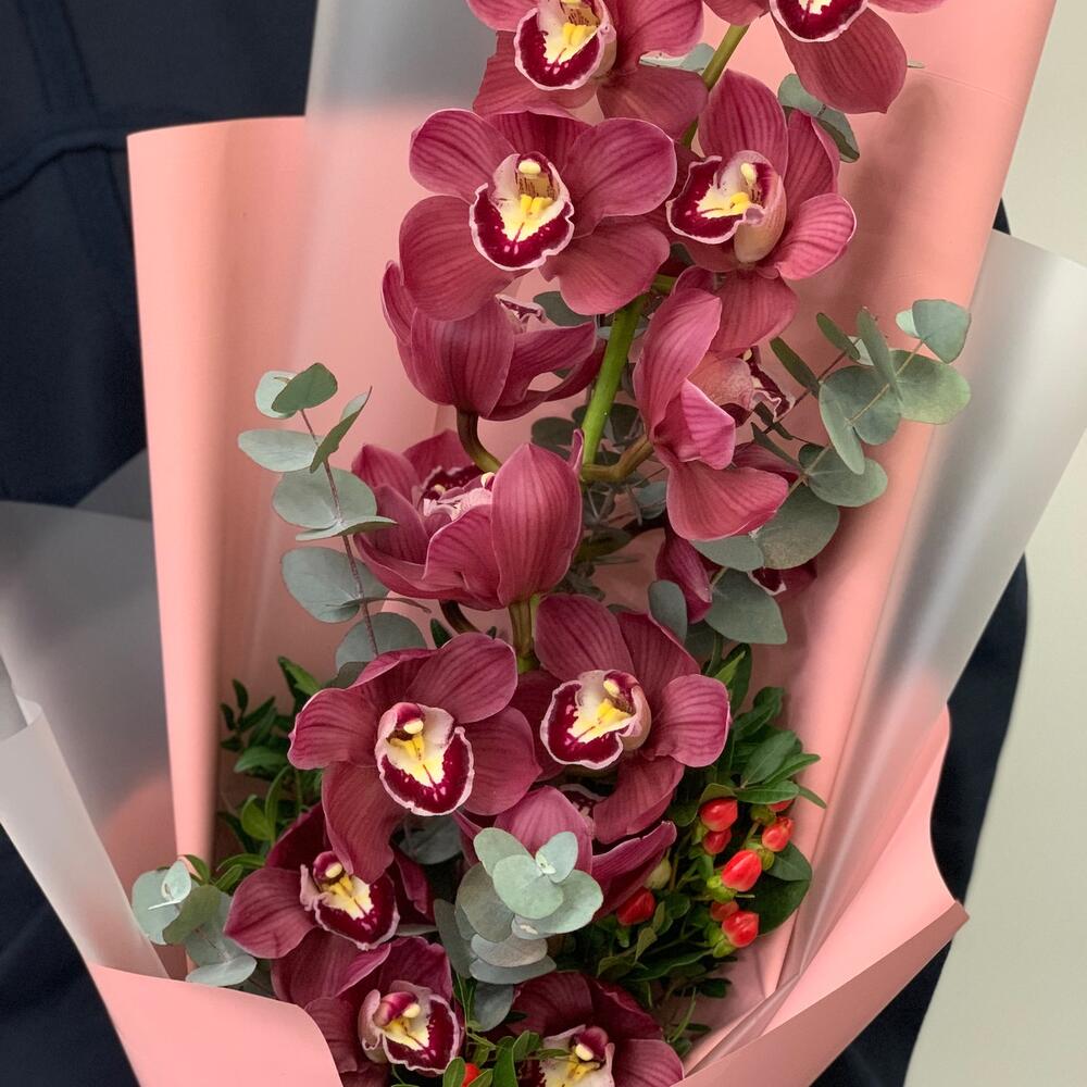 Орхидея Цимбидиум – 1 шт.эвколиптом – 1 шт.Гиперикум – 1 шт.Дизайнерская упаковка – 3 шт.