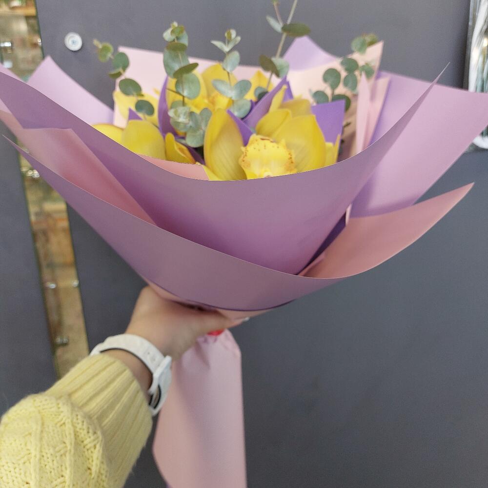 Орхидея Цимбидиум – 7 шт.Эвкалипт – 5 шт.Упаковка дизайнерская – 3 шт.Лента атласная – 2 шт.
