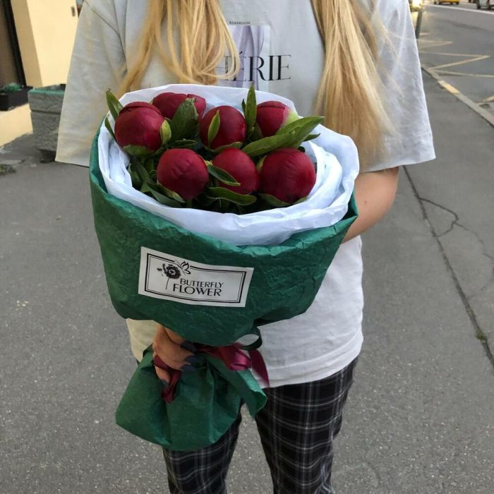 Букет из 7 бордовых пионов в дизайнерской упаковке “Лючия Грация”