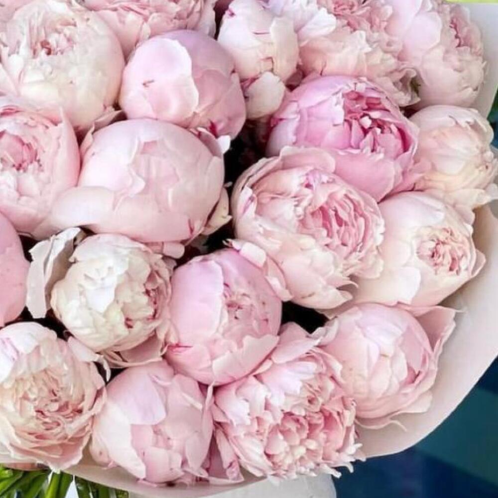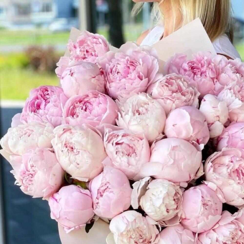 пионы розовые – 35 шт.Упаковка дизайнерская – 2 шт.Лента атласная – 2 шт.Открыточка с вашими пожеланиями – 1 шт.хорошее настроение – 100 шт.инструкция по уходу за цветами – 1 шт.коробка переноска – 1 шт.Кризал – 1 шт.