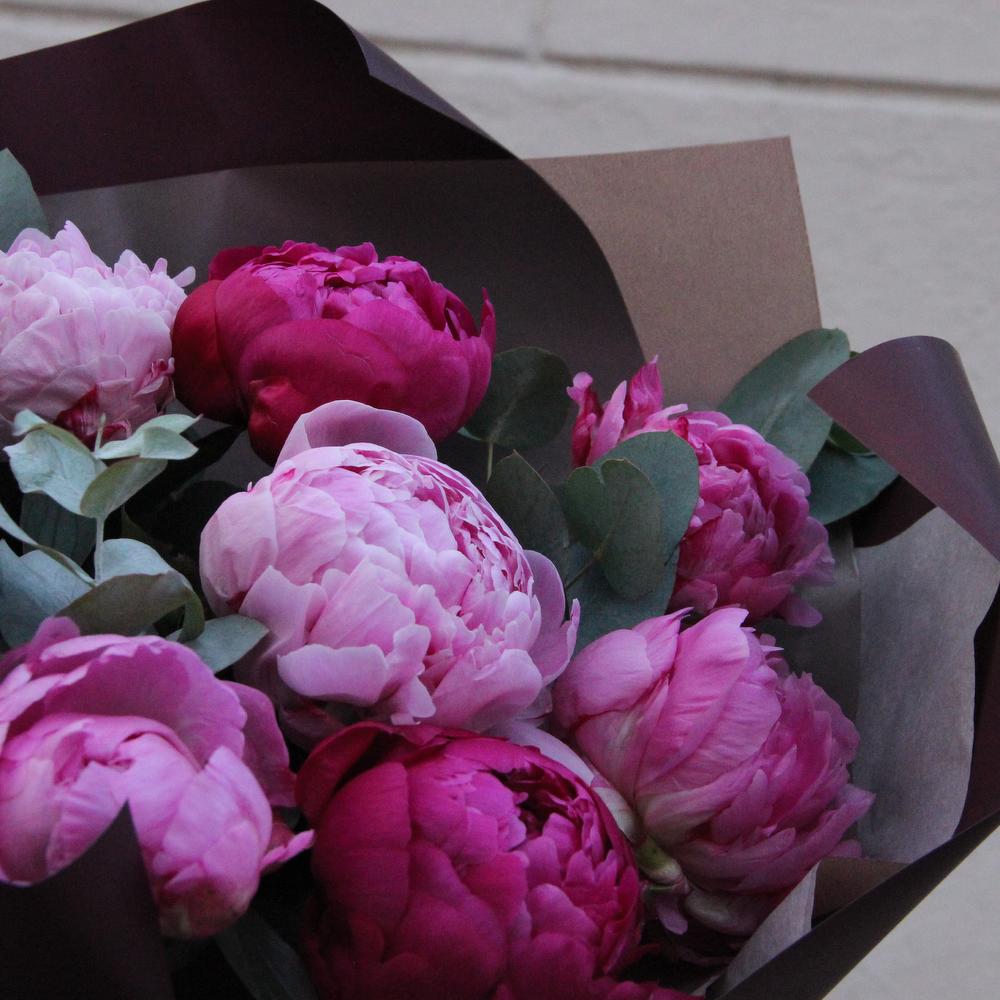 Эвкалипт – 7 шт.Упаковка – 2 шт.Лента атласная – 2 шт.Пион Голландия – 9 шт.