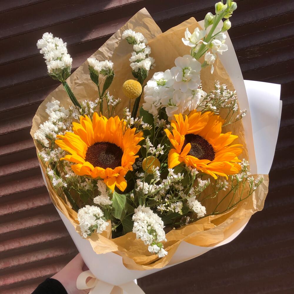 Краспедия – 2 шт.Лента – 1 шт.Лимониум – 1 шт.Статица – 2 шт.Тишью – 2 шт.Пленка матовая – 3 шт.маттиола белая ароматная – 1 шт.подсолнух гелиантус – 2 шт.