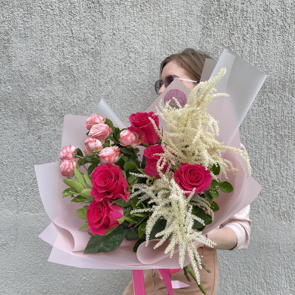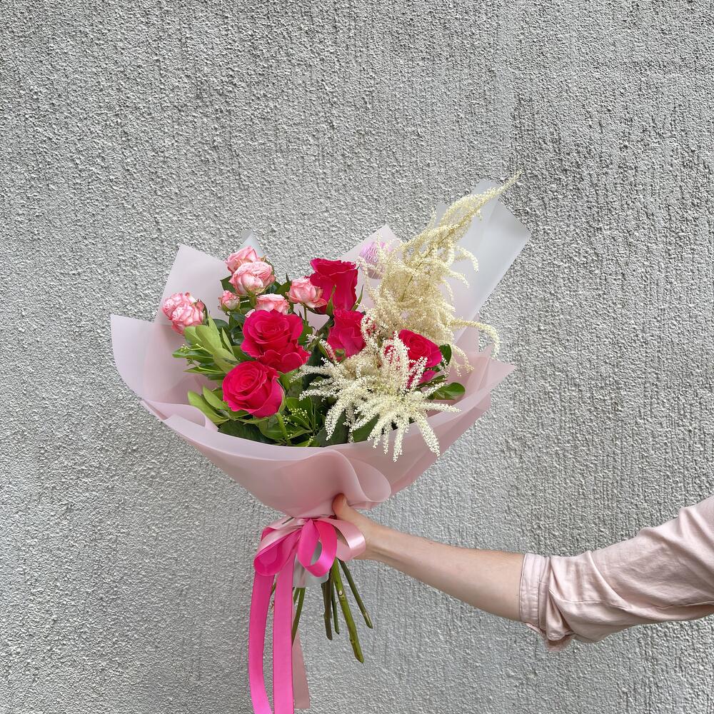 роза кустовая (ветки) – 2 шт. Роза одноголовая – 5 шт. зелень флористическая – 3 шт. сухоцвет (замена по наличию) – 2 шт. Упаковка – 1 шт. Атласная лента – 1 шт.