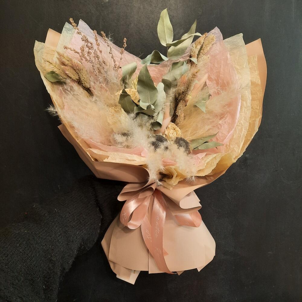 Целозия – 3 шт.Эвкалипт – 3 шт.Роза – 3 шт.Подсолнух – 4 шт.Лагурус – 7 шт.Дизайнерская упаковка – 1 шт.кортадерия – 1 шт.