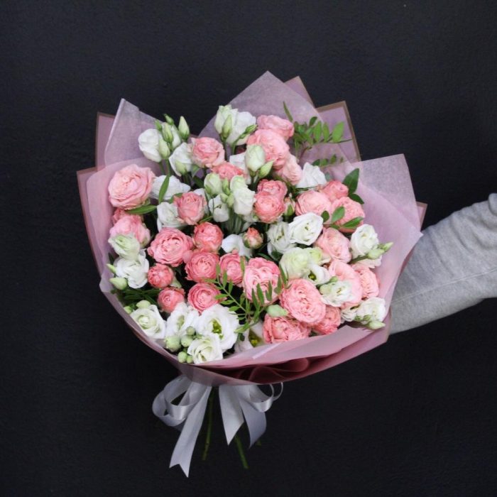 Эустома – 7 шт.Роза кустовая пионовидная мадам бомбастик – 10 шт.Фисташка – 2 шт.Тишью – 2 шт.Пленка дизайнерская – 2 шт.Лента атласная – 2 шт.