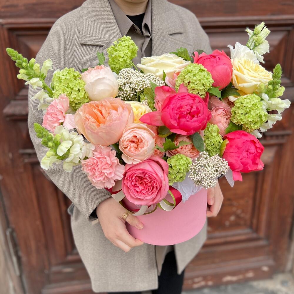 Вибурнум – 2 шт.Озотамнус – 2 шт.Лента атласная – 2 шт.Тишью – 1 шт.Диантус – 3 шт.Коробка шляпная – 1 шт.Роза остина пионовидная – 2 шт.Оазис флористический – 1 шт.Эустома белая махровая – 1 шт.джульетта роза пионовидная – 1 шт.Пион коралл шарм – 3 шт.антиринум – 3 шт.роза кэндллайт – 3 шт.