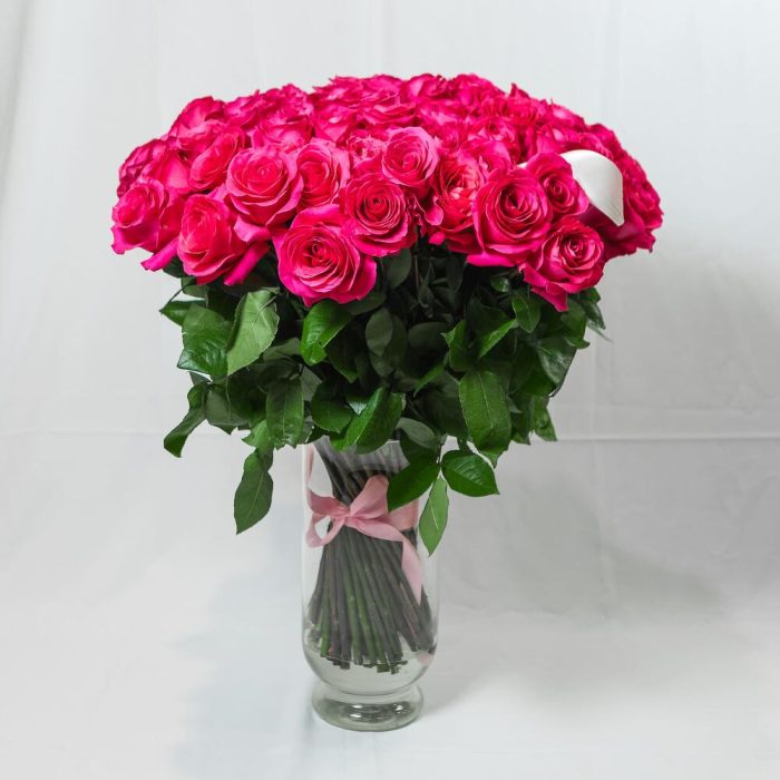 Роза эквадор розовая – 101 шт.Пленка прозрачная – 1 шт.Лента атласная – 1 шт.
