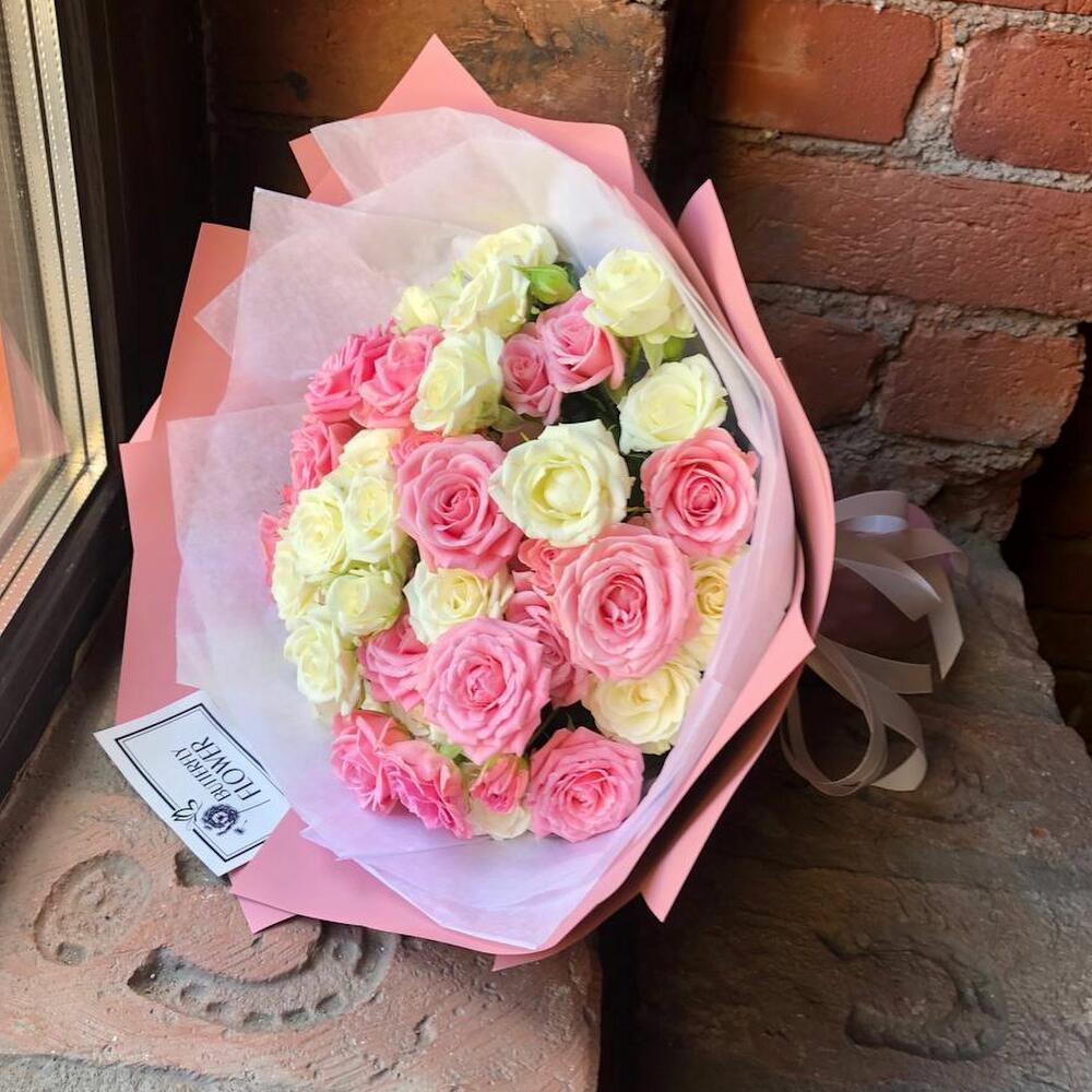 Букет из 15 белых и розовых кустовых роз “Розовый туман”