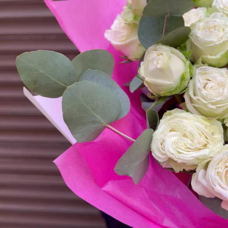Эвкалипт – 7 шт.Лента атласная – 2 шт.Тишью – 2 шт.Пленка матовая – 2 шт.Роза кустовая пионовидная бомбастик – 15 шт.