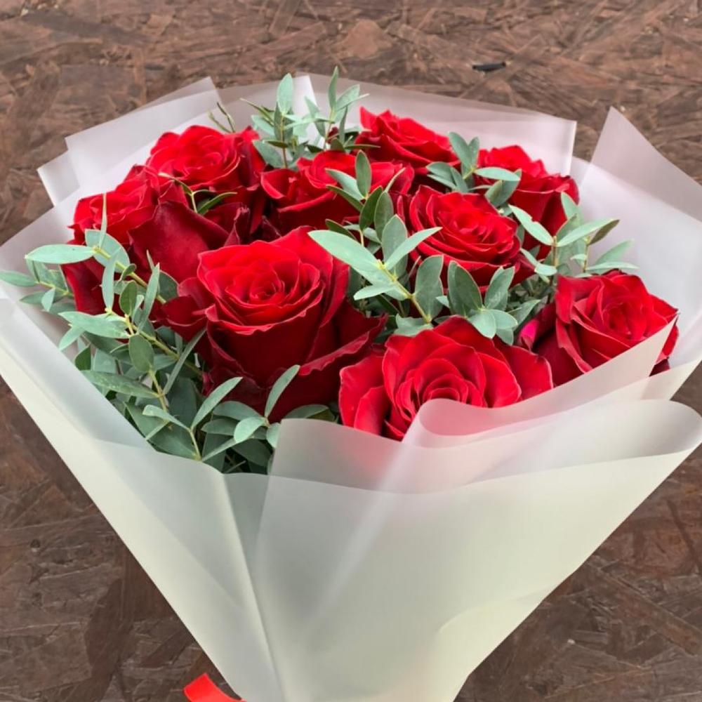 Букет из красных роз и ароматного эвкалипта