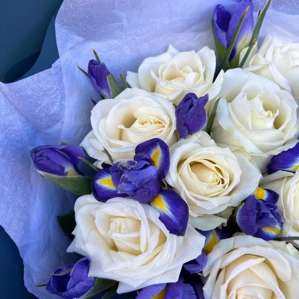 Роза белая 60 см – 10 шт.Ирис Blue Magic – 13 шт.Тишью – 2 шт.Дизайнерская упаковка – 3 шт.Лента атласная – 2 шт.