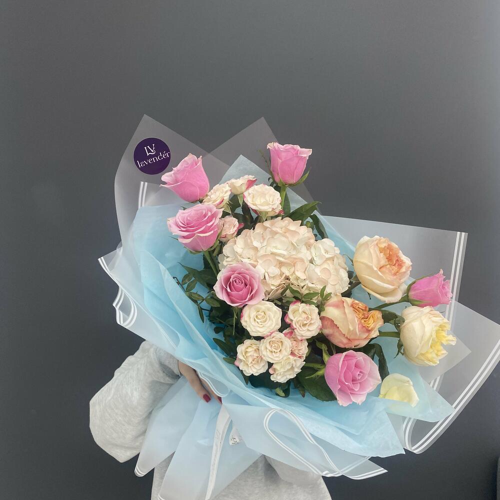 Альстромерии, Гвоздики, Кустовые розы, Лизиантусы, Розы, Хризантемы