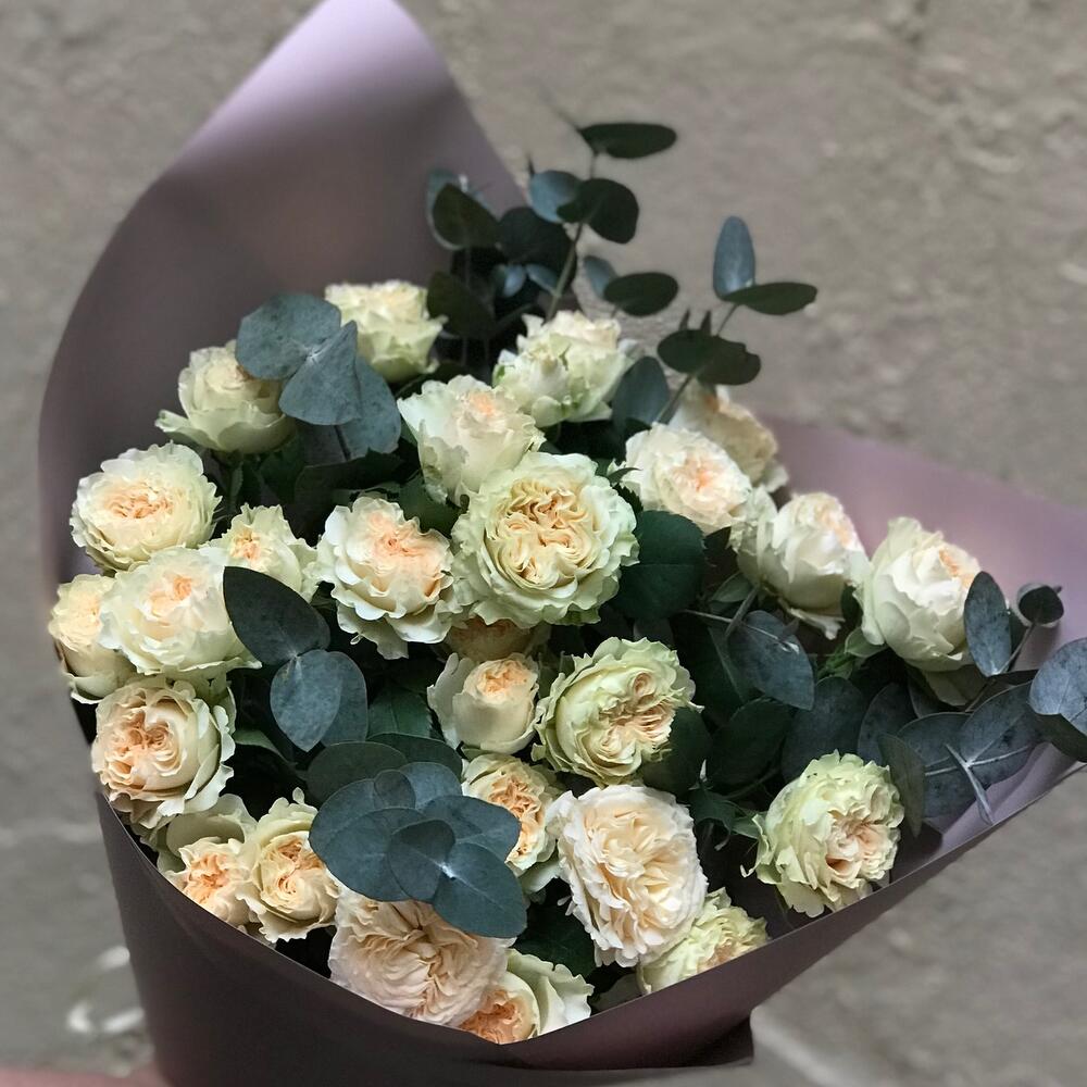 роза кустовая пионовидная саммер – 5 шт.эвкалипт цинерея пучок – 1 шт.Упаковка дизайнерская – 1 шт.