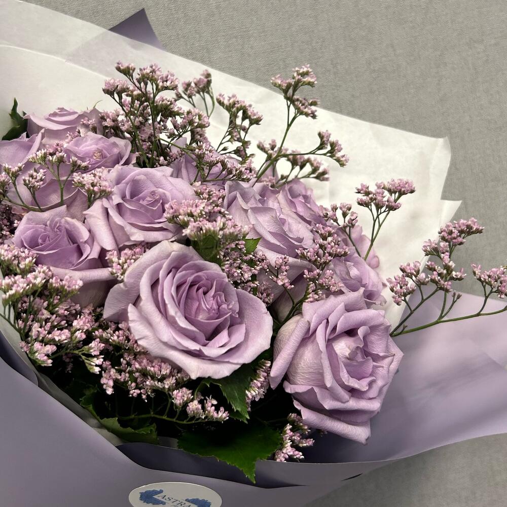 Лимониум – 2 шт.Лента атласная – 1 шт.Роза оушен сонг – 9 шт.Авторская упаковка – 1 шт.