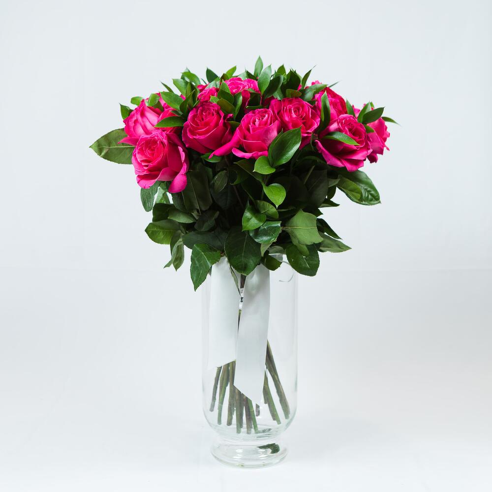 роза розовая эквадор 60 см – 25 шт.Рускус сочи – 9 шт.Лента атласная – 1 шт.