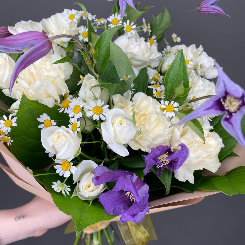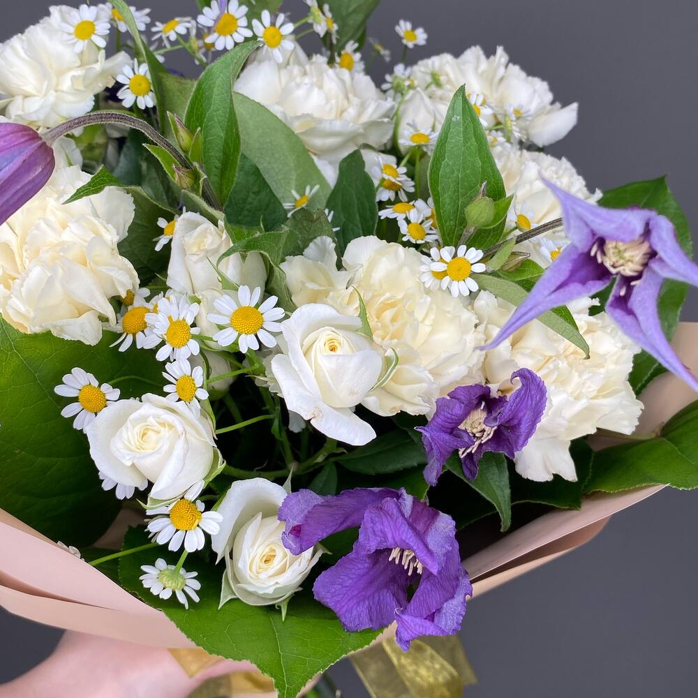 Клематис Блю Пируэт – 3 шт.Танацетум – 3 шт.Диантус лимонный – 7 шт.Роза кустовая белая – 3 шт.Салал пучок – 1 шт.Упаковка дизайнерская – 1 шт.Лента золотая – 1 шт.