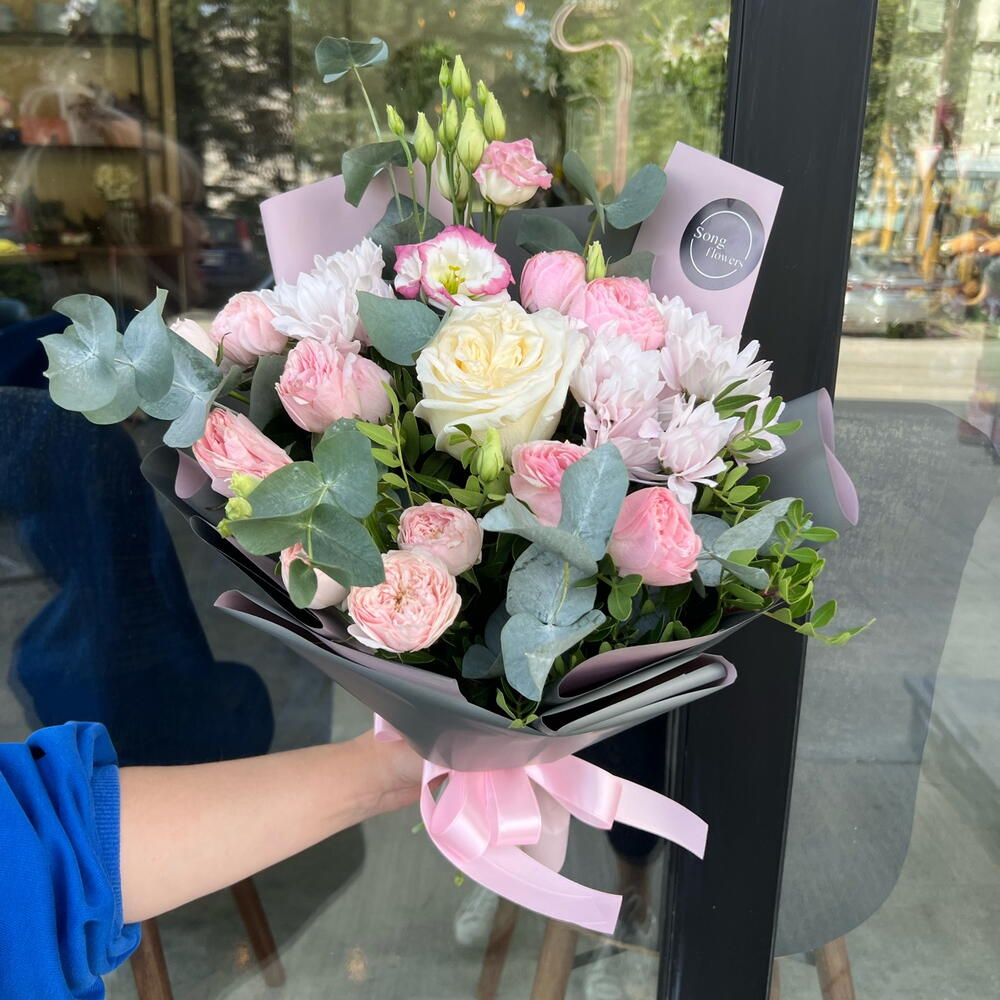 Альстромерии, Гвоздики, Кустовые розы, Лизиантусы, Розы, Хризантемы
