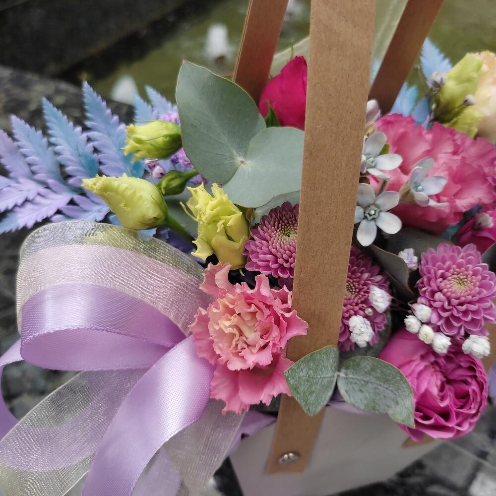 Роза кустовая пионовидная – 1 шт.Хризантема кустовая – 2 шт.Гипсофила – 1 шт.Лизиантус – 1 шт.Ваксфлауэр – 1 шт.Эвкалипт – 1 шт.Папоротник – 2 шт.Лента – 2 шт.Сумочка картонная – 1 шт.